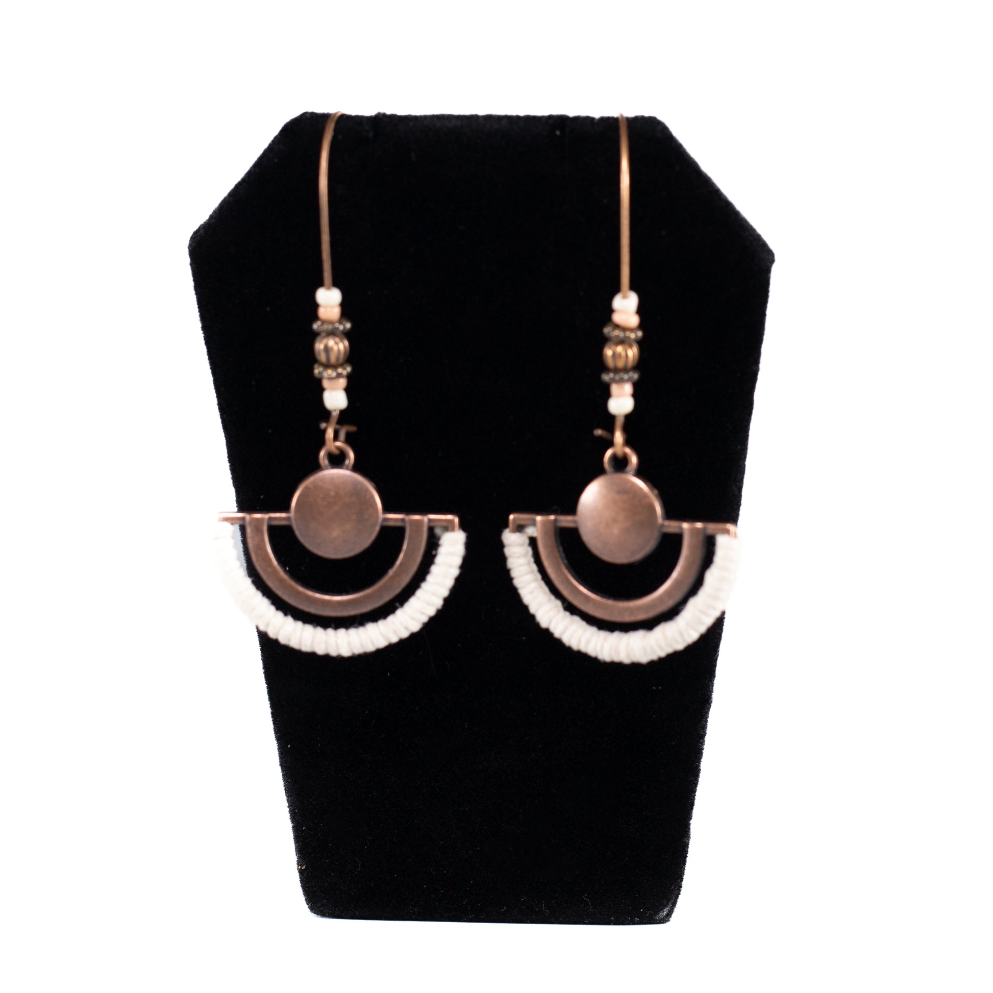 Go modern‐rustic with our Mesa Crescent earrings. Copper arcs wrapped in white thread hang gracefully below coordinating beaded accents, adding a soft boho twist to your everyday style.