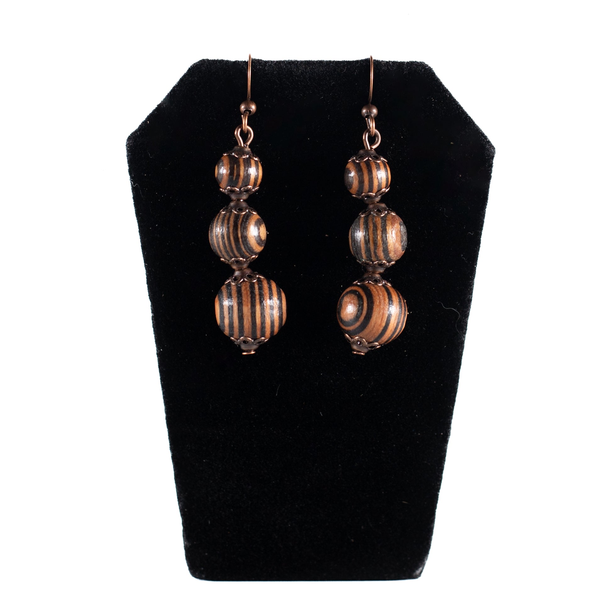Channel rugged elegance with our Saddle Stripes earrings. Triple‐stacked wooden beads showcase rustic stripe patterns, complemented by antique copper findings. Lightweight yet striking, these earrings bring a timeless western flair to any outfit—from laid‐back denim days to nights on the town.